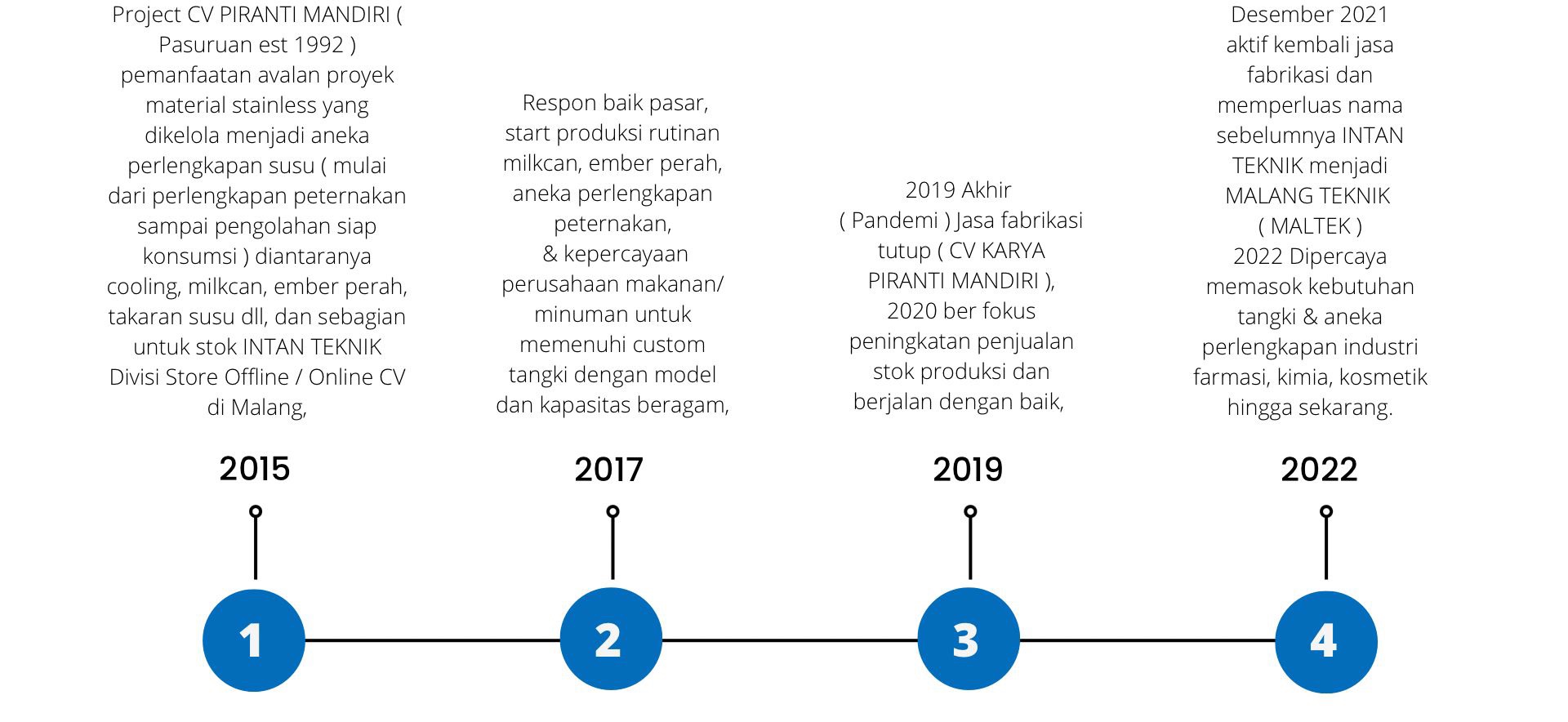 CV KARYA PIRANTI MANDIRI berawal dari memanfaatkan avalan material stainless untuk memproduksi berbagai perlengkapan peternakan khususnya industri susu, seperti, milkcan, ember perah, takaran susu hingga cooling tank.